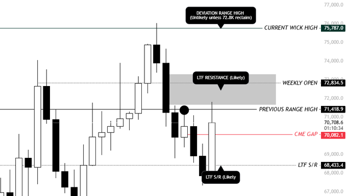 The chart structure is where focus now sits. According to KillaXBT on X, the 68.4K retest was successfully reclaimed, leading to the CME gap filling and a push up to 71.4K. KillaXBT flagged that level as the first resistance area.