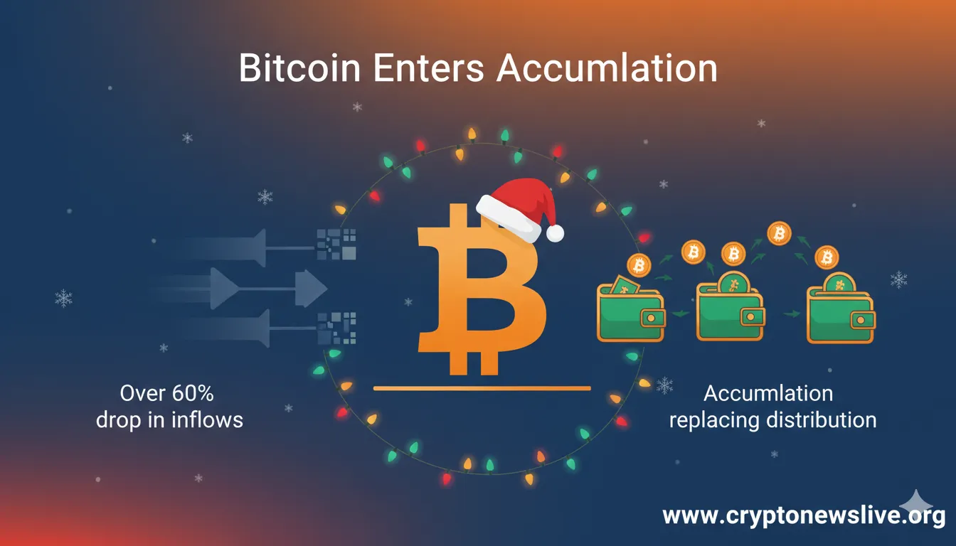 Bitcoin exchange inflows have plummeted more than 60% while prices hold steady, revealing a dramatic shift from distribution to accumulation as traders pull back from active positioning.