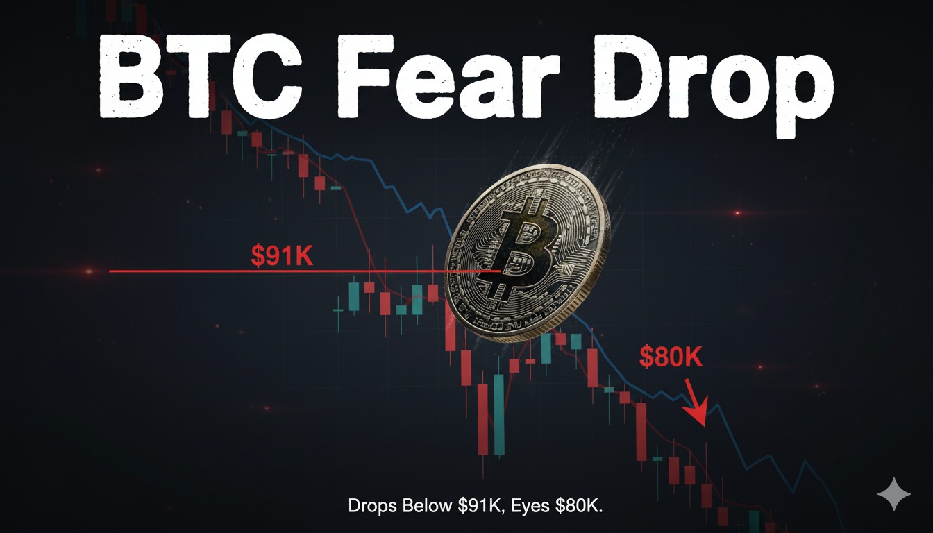 Bitcoin has dropped below $91,000, sparking intense market fear. Traders now eye a potential plunge to $80,000 as broad crypto sell-offs deepen this November downturn.