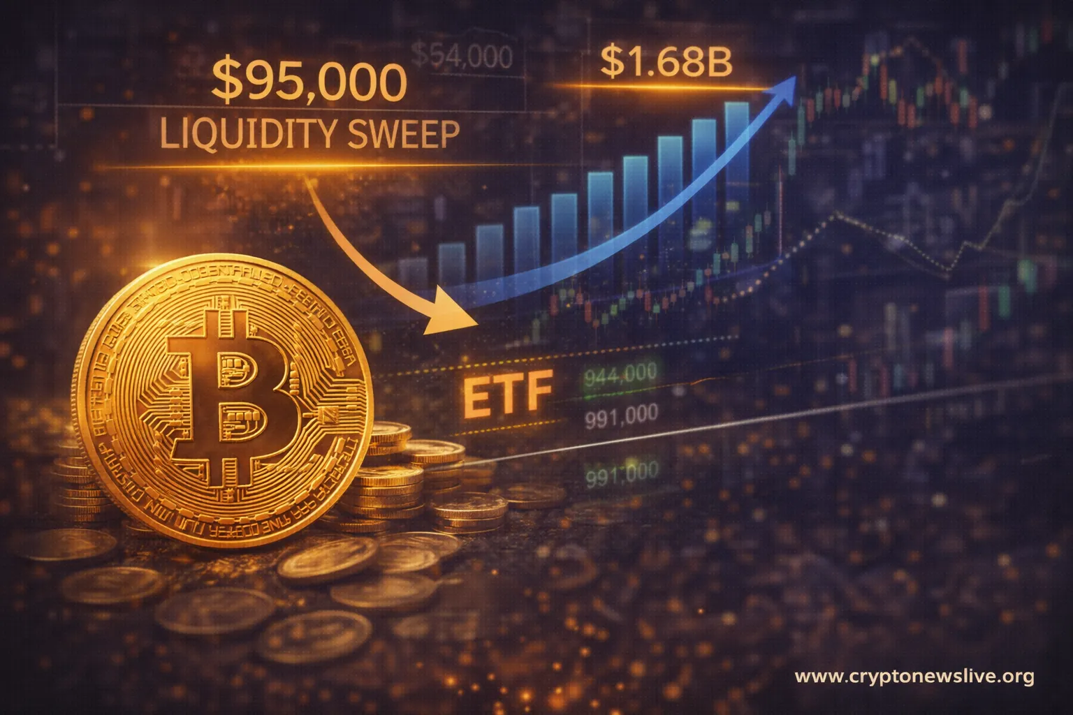 Bitcoin executes liquidity sweep near $95,000 as ETFs accumulate $1.68B. Technical traders position for reversal with key levels in focus amid institutional buying pressure.