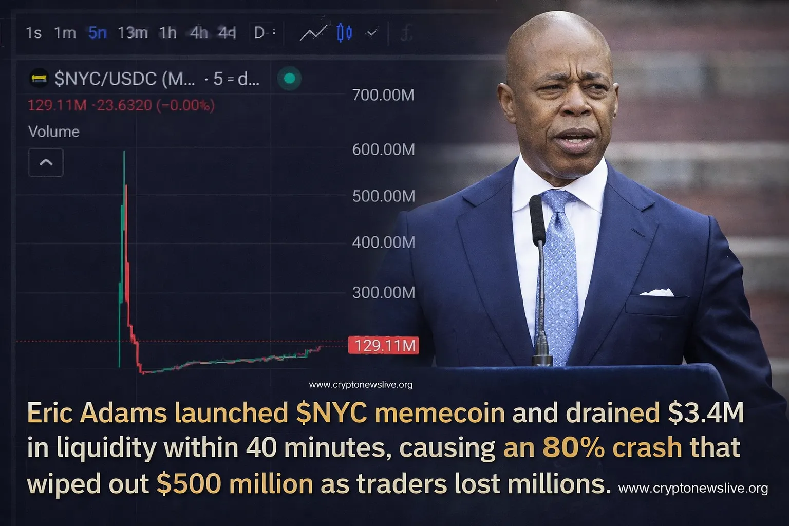 Eric Adams launched $NYC memecoin and drained $3.4M in liquidity within 40 minutes, causing an 80% crash that wiped out $500 million as traders lost millions in the political rugpull.