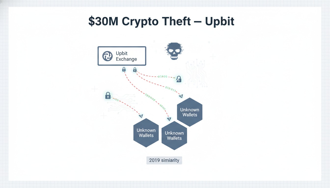North Korea's Lazarus Group allegedly stole $30M in crypto from Upbit exchange. Authorities investigate ties to 2019 breach as hackers launder funds.