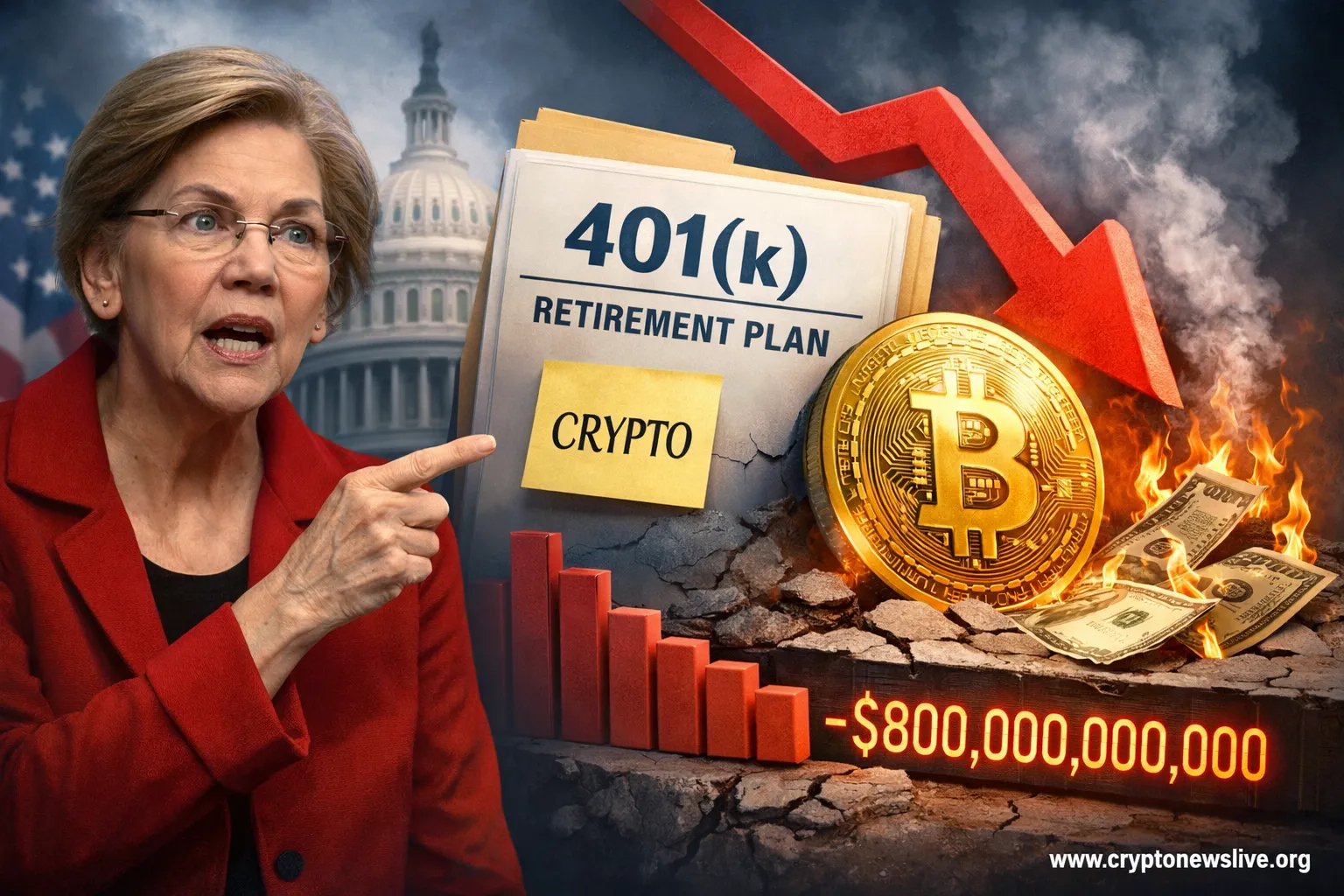 Elizabeth Warren warns SEC that Trump's crypto 401(k) order exposes workers to massive losses. Bitcoin's $800B crash highlights retirement risks.
