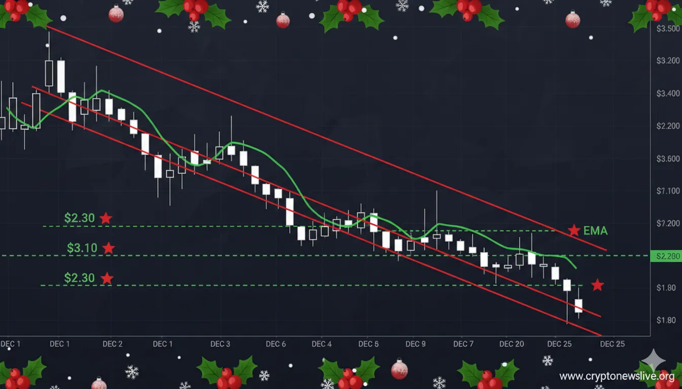 The technical setup involves three critical markers: a close above the 21 exponential moving average, a successful retest that holds as support, and a decisive break through the channel top near $2.30. These elements combined would signal a momentum shift opening pathways toward $3.10 to $3.30.