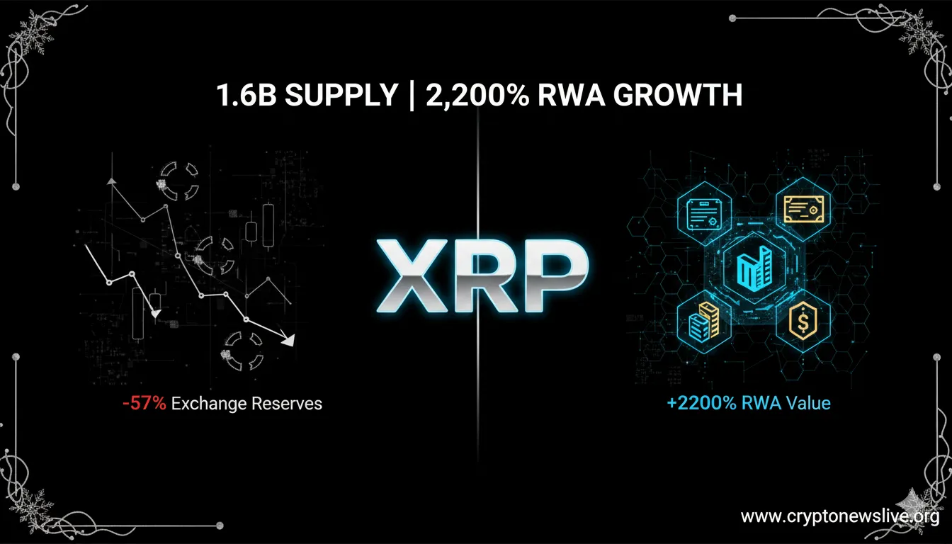 XRP exchange supply drops to 1.6B tokens while tokenized RWA on XRPL explodes 2,200% in 2025. Institutional adoption accelerates heading into 2026.
