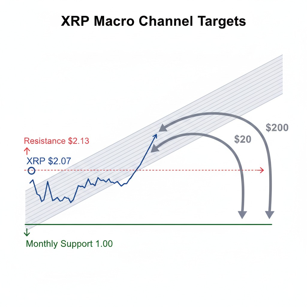 XRP hovers at $2.07 as technical analysts project ambitious targets from $20 to $200 based on macro channel patterns. The token must reclaim the $2.13 resistance level to trigger bullish momentum, while maintaining support above the critical $1.00 threshold on monthly timeframes.