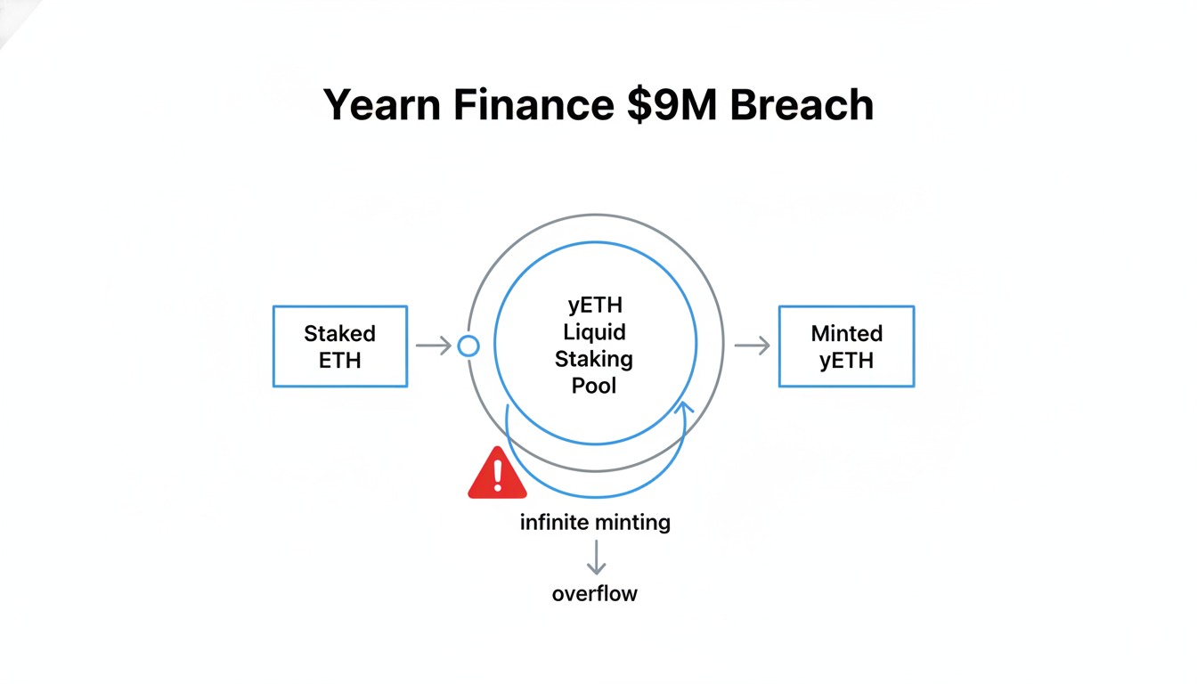 Yearn Finance suffered a $9 million security breach through an infinite token minting vulnerability in its yETH liquid staking pool, with the attacker exploiting a critical mathematical error in the smart contract's invariant calculation system.